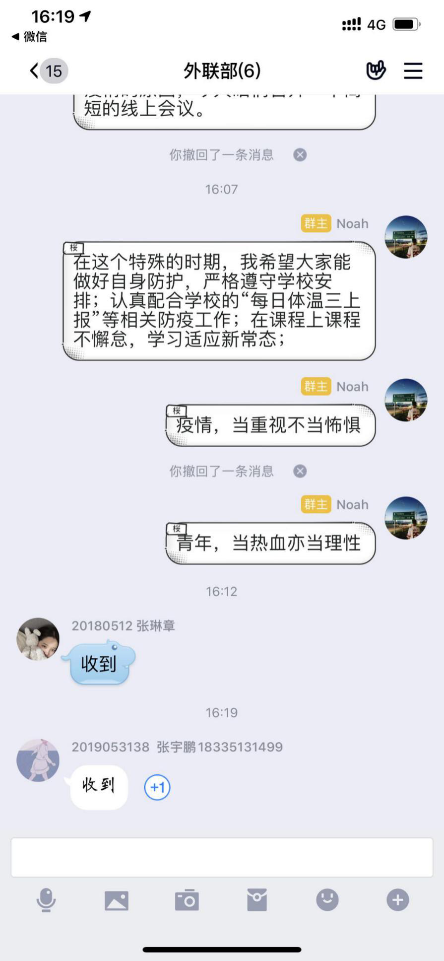 各部门会议主要内容有:对部门近期的工作情况进行总结与交流,对此前部门所做工作表示肯定并提出勉励,同时指出当前工作中存在的一些问题与不足,进一步明确接下来的工作要求。会议期间,各部门都提到了换届的相关事宜,鼓励部门成员积极争取,挑战自己。此外,各部门部分同学还向大家分享了疫情期间自己的学习经验,告诫大家线上学习更要自觉自律,端正学习态度,为接下来的学习做好规划,并且鼓励大家积极锻炼,不断提升自己。在各部门就疫情期间的学习与生活的讨论中,大家纷纷表示坚决秉持个人不传谣不信谣态度,在校做好消毒等防护工作,学习上更会严格要求自己,保证自己学习质量。