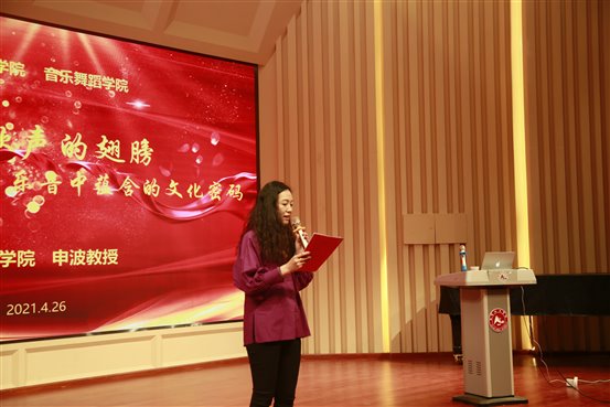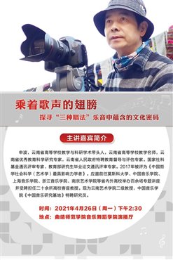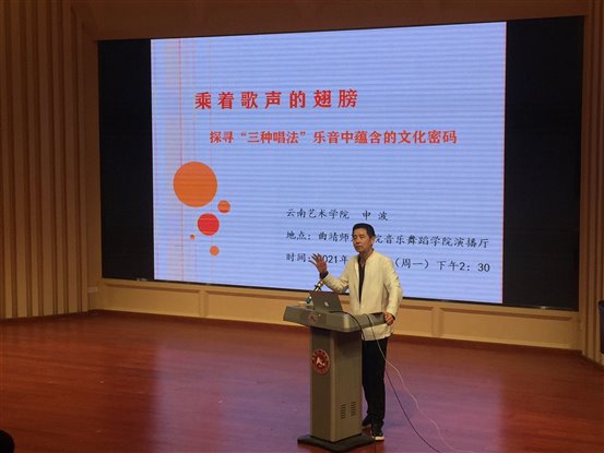 2021年4月26日,音乐舞蹈学院演播厅,学院教师和音乐学专业的学生,认真听取了云南艺术学院申波教授,做的主题为《乘着歌声的翅膀——探寻“三种唱法”乐音中蕴含的文化密码》的学术讲座。