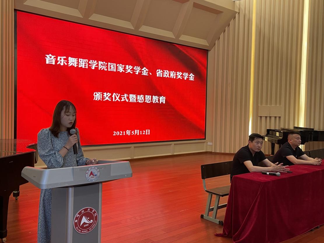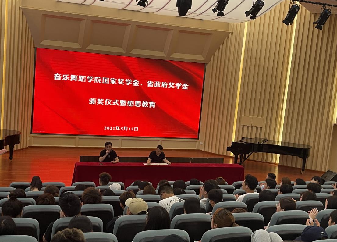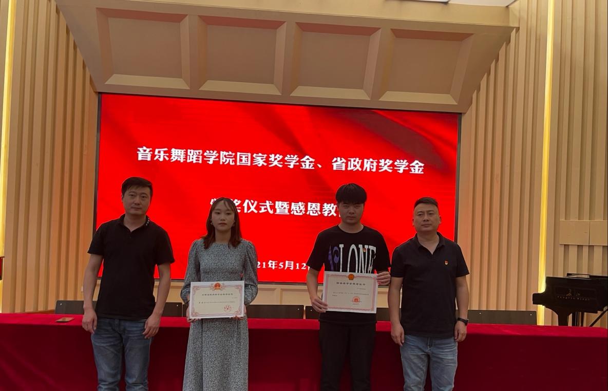 5月12日下午,音乐舞蹈学院在演播厅组织开展国家奖学金、省政府奖学金颁奖仪式暨感恩教育活动。学院党总支副书记李韬老师和学生事务处中心主任刘德任老师出席了颁奖仪式,并由副书记李韬为两位同学颁发荣誉证书。